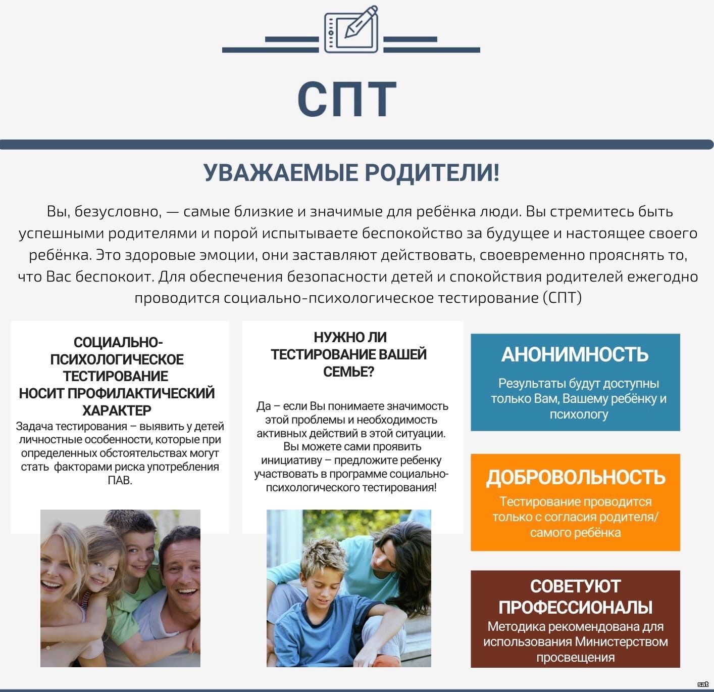 Результаты СПТ важны для разработки дополнительных адресных мер и оценки эффективности профилактической деятельности в образовательной среде, не являются достаточным основанием для постановки тестируемого на какой-либо вид учета (внутришкольный, наркологический учет или постановки иного диагноза).